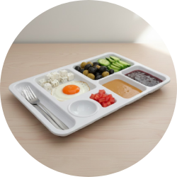 • Bazı üretimler arasında ise bölmeli melamin servis tabağı da görülebilmektedir. İkiye veya üçe ayrılmış bölmeler sayesinde sulu ve kuru yemekler, tatlılar birbirine karışmayacaktır.